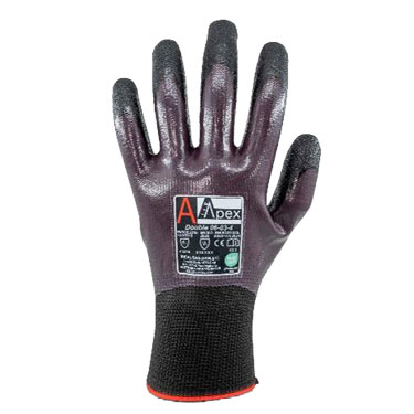 Apexdouble, avuç içinde uygulanan ikinci köpük nitril kaplama ıslak ve yağlı ortamlarda üstün tutuş sağlar.