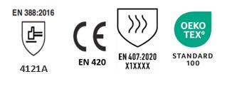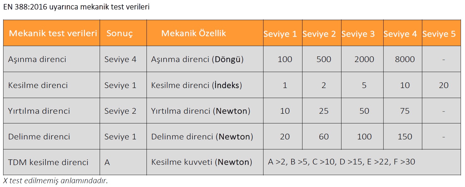 Bu ürün EN420 (Koruyucu eldivenler için genel gereklilikler ve muayene yöntemleri) ve EN388 (Mekanik Risklere Karşı Koruyucu) testlerinden geçmiştir.